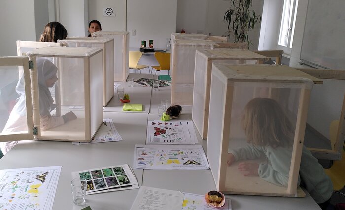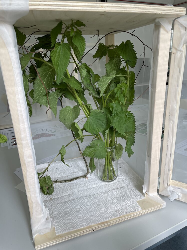 Die Hauptattraktion waren die Raupenkasten, auch Aerarien genannt. Diese haben wir unfallfrei mit Brennnesseln und Raupen vom nahegelegenen Waldrand bestückt. So kann zu Hause die Entwicklung von der Raupe über die Puppe zum Falter beobachtet werden. Dass viele verschiedene Arten gerne an Brennnessel fressen, konnten die Kinder direkt beobachten: Die Raupen sahen nicht identisch aus. Nicht nur die Grösse war unterschiedlich, sondern auch die Musterung, weil es sich um verschiedene Arten handelt. Es ist ein Mix aus Tagpfauenaugen, Landkärtchen und dem Kleinen Fuchs.